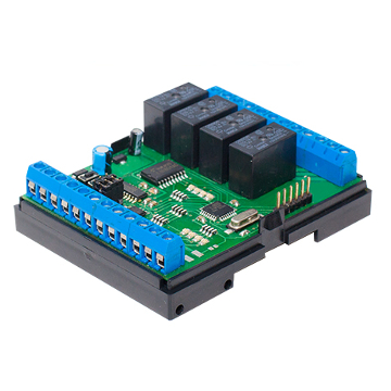 Input-output module DV-RB8D is an electronic addressable controller used as part of the DIVISION automation system, connected to the DV-HEAD OMEGA central controller via the RS485 interface. The DV-RB8D controller has 4 discrete inputs of the ”0” -”1” type, to each of which sensors with a relay output or with an open collector can be connected to connect OPS sensors, as well as to connect liquid level sensors, sensors water or gas leaks, current sensors, generator operation sensors, rain sensors, scenario and alarm buttons, etc. Also, the DV-RB8D controller has 4 ”dry” relay outputs, contacts (NC. NO. C), for controlling E/M eaves, electric motors, automatic gates, electric starters, etc. The I/O module board DV-RB8D provides indication of the status of inputs and outputs. To test and assign an address to the DV-RB8D controller in the DIVISION system, connect it to a personal computer using a USB/RS485 interface converter and run the DIVISION CONTROLLERS program. Size 4-DIN. Connector pitch 3.81.